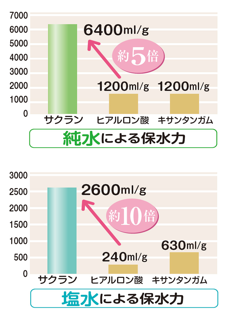 改良ティーバッグ法にて、サクラン、ヒアルロン酸、キサンタンガムの保水試験を実施しました。各サンプル1g(乾燥重量)に対する保水した水の体積(ml) を測定した結果、サクランは自重に対し、6,000倍以上の保水力を示すことが分かりました。この数値は、一般の化粧品で保水力が高いと言われるヒアルロン酸と比べると、純水で約5 倍、塩水では約10 倍高いことが分かりました。