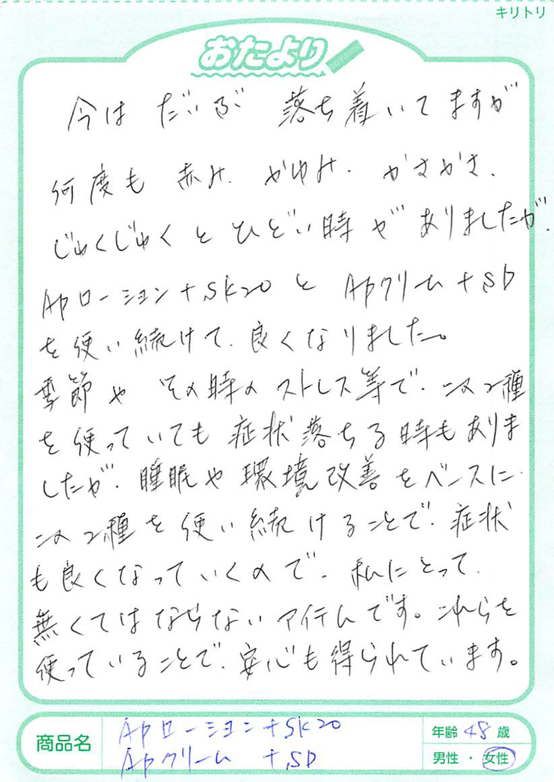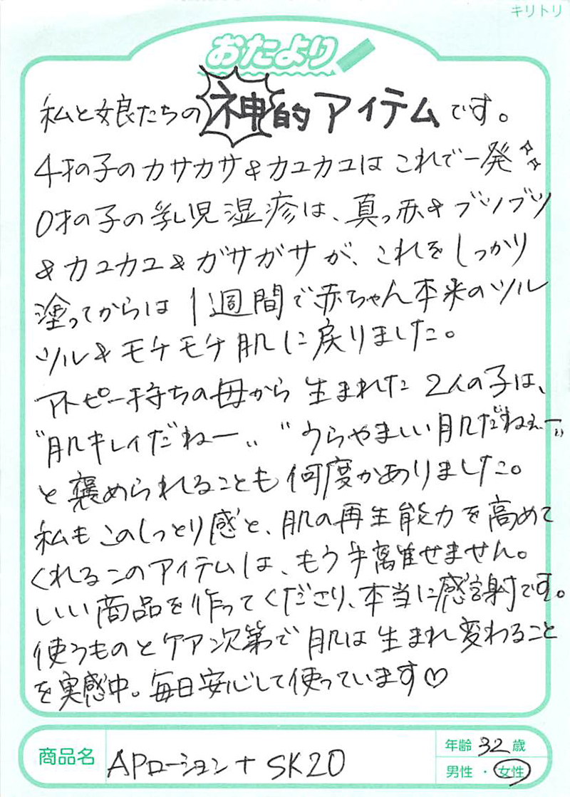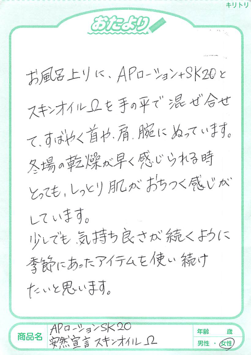 バリア機能をアップさせるため、2~3回の重ね塗りを行ってみましょう。 また、もともとの乾燥状態が強い方は、APローション+SK20を塗布後、安然宣言スキンクリームや安然宣言スキンオイルΩで、保湿・保護ケアを重ねて行うと良いでしょう。