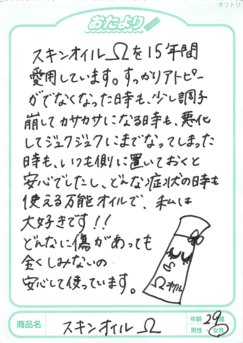 発売以来アトピー皮膚炎のかたに支持され、信頼されているオイルです。傷や炎症がある離脱中にも肌にしみず、しっとり感が続くことが人気の理由です。