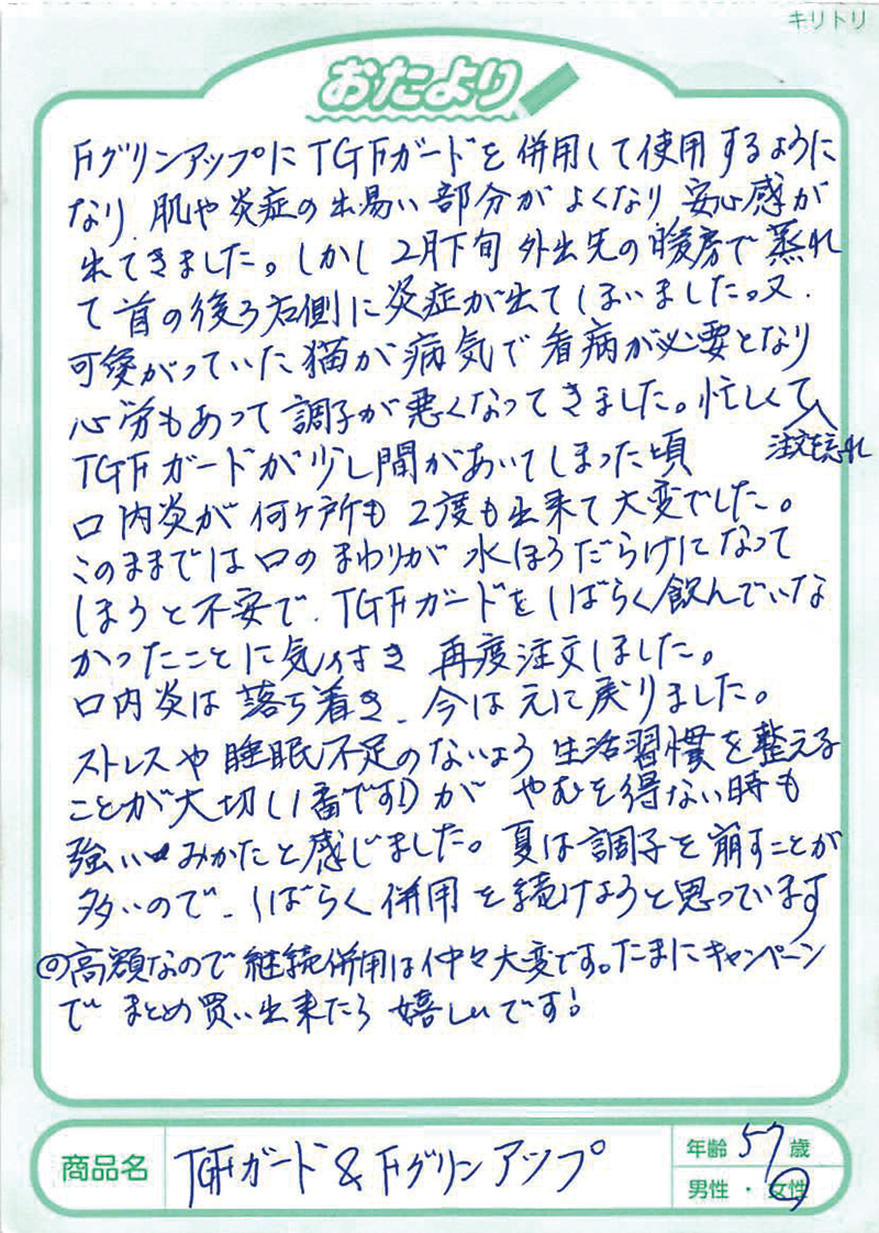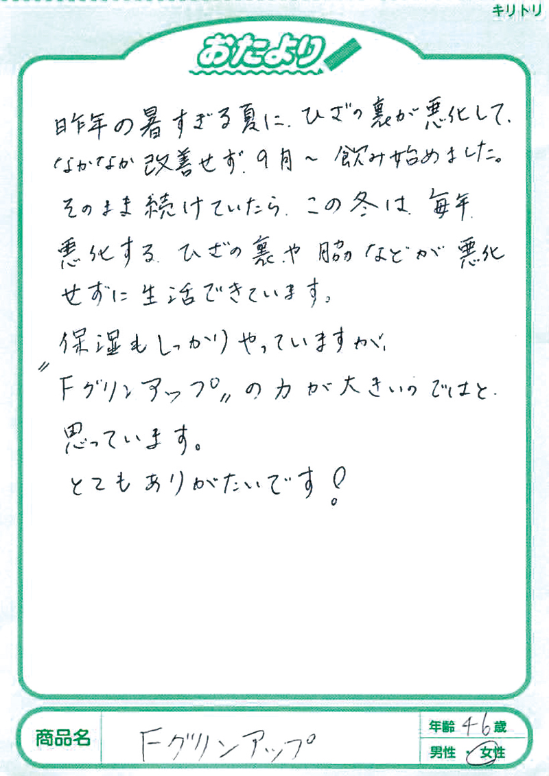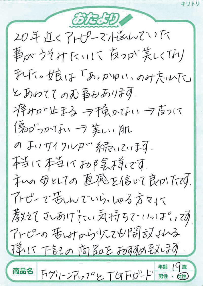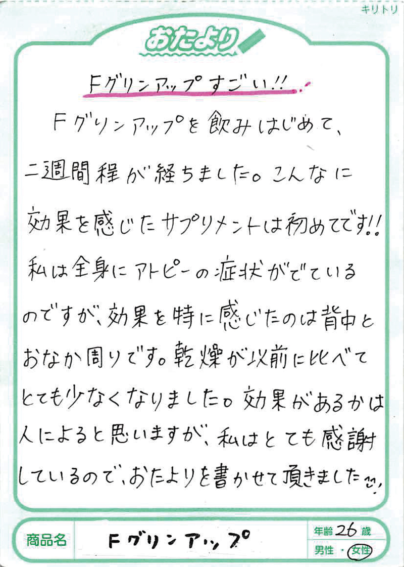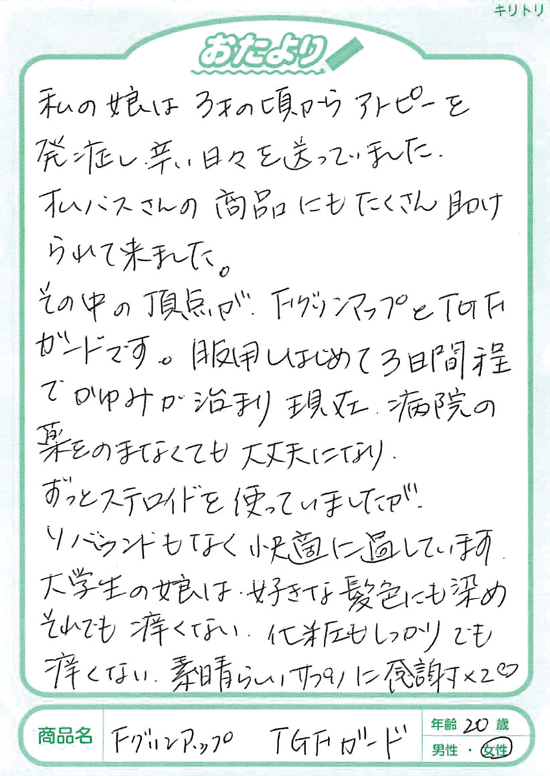 アトピー性皮膚炎の方にフィラグリンが少ないことは2013年に京都大学が発表していました。このフィラグリンについては、欧米の研究でかなり前から肌トラブルに関係していることがいわれていましたが、日本大学の桑原正人先生は、犬のアトピー性皮膚炎の研究からフィラグリンの減少、そしてヘルパーT細胞のⅢ型(Th3)へのアプローチが大切であることを突き止めておられました。1,000例以上の犬のアトピーへの研究を、その後、ヒトにも応用して生まれたのがFグリンアップです。